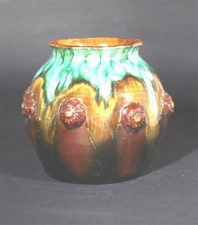 A Linthorpe Pottery Anglo Saxon vase designed by Dr Christopher Dresser, ovoid with applied flower heads, covered in a running green glaze unsigned 15cm. high