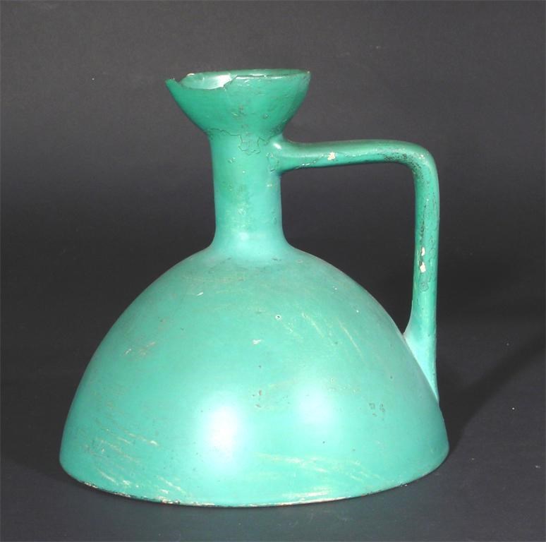 A Linthorpe Pottery jug designed by Dr Christopher Dresser, model no.606, covered in a matt blue glaze impressed marks, facsimile signature, underglaze chips to spout 18cm. high