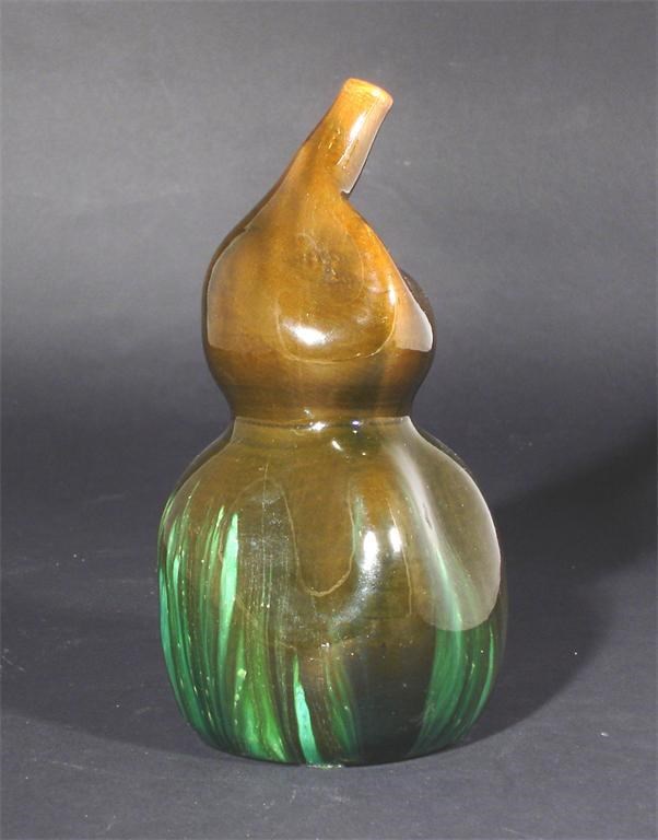 A Linthorpe Pottery double gourd Saki Bottle vase designed by Dr Christopher Dresser, with angled neck/spout, running green and brown glaze indistinct marks, minor glaze nicks to top rim, chip to underside of base rim 21cm. high Literature Michael Whiteway Christopher Dresser A Design Revolution V&A page 173 catalogue number 234 for a comparable form.