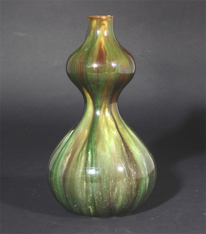 A Linthorpe Pottery double gourd vase designed by Dr Christopher Dresser, model no.142, covered in a running green, ochre and brown glaze impressed marks, facsimile signature, minor chips to top rim 22cm. high Literature Michael Whiteway Christopher Dresser 1934-1904 Skira page 119 plate 117 for a comparable double gourd vase