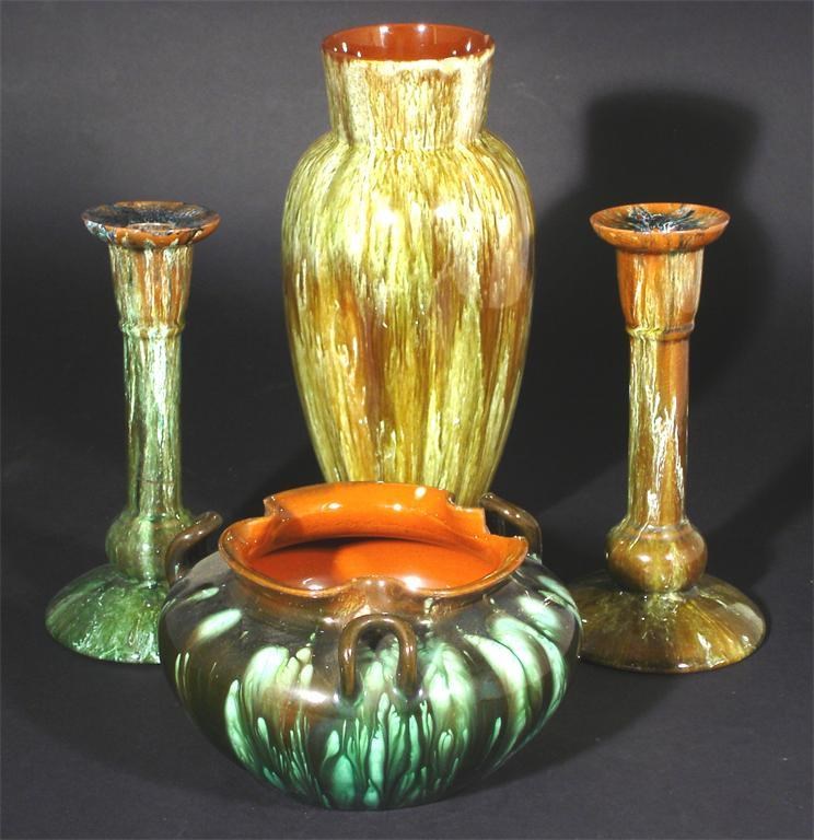 A Linthorpe Pottery vase model no.876, shouldered form, covered in a running olive green glaze, a pair of candlesticks model no.1931 and a compressed vase with loop handles model no.2175 impressed marks, minor damages 24cm. high