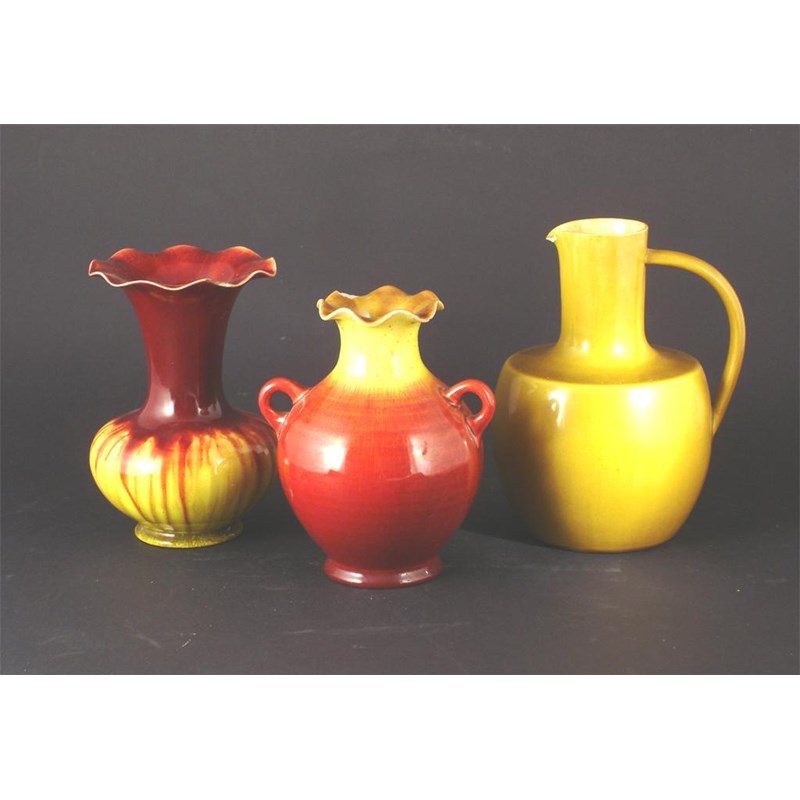 A Linthorpe Pottery vase model no.1816, a vase 2174 and a ewer model no.665, glaze in colour impressed marks, chips 16cm. high