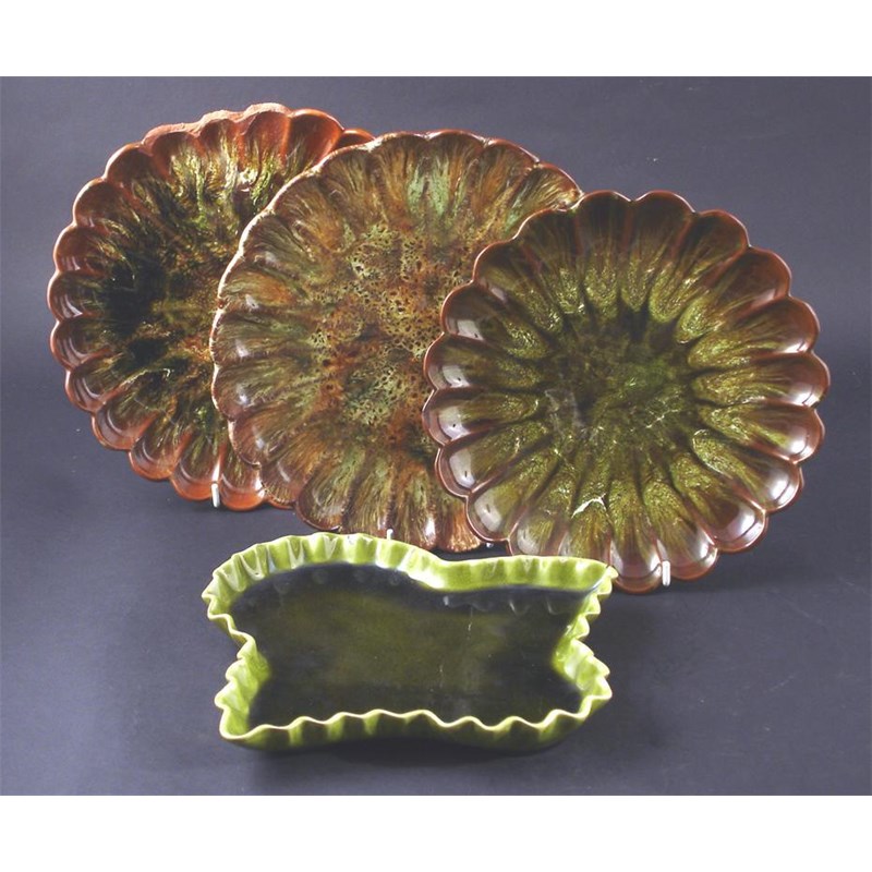 Three Linthorpe Pottery lily pad plates designed by Dr Christopher Dresser, model numbers 434 and 435, covered in a running mottled green glaze, and a Linthorpe Pottery leaf shaped dish model no.1386,  impressed factory marks, facsimile signature, damages and restoration largest 23cm. diam.
