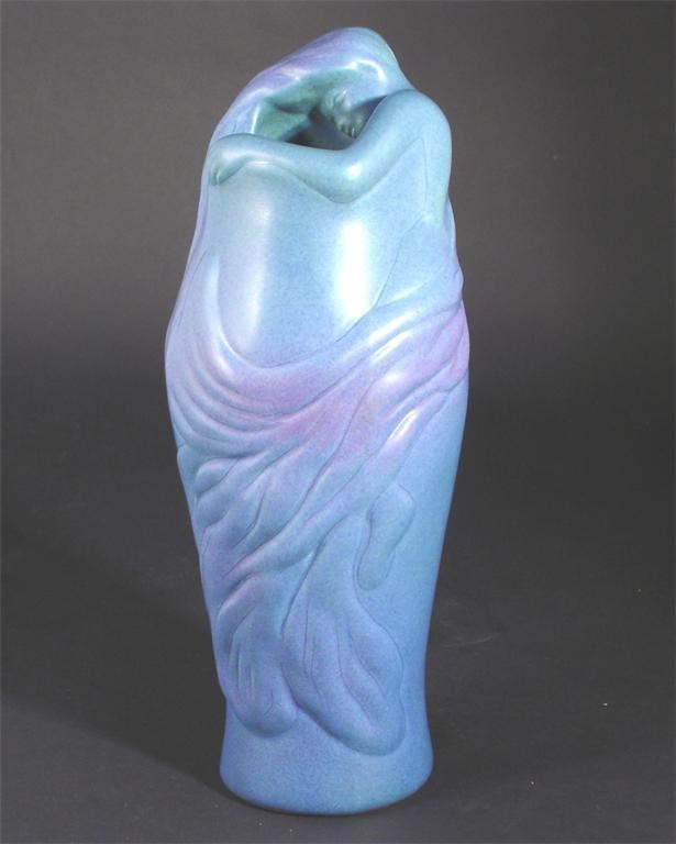 A Van Briggle pottery vase the neck cast as a maiden with long flowing hair, covered in a graduated purple to blue glaze incised marks 29cm. high Provenance The Bill Coles collection