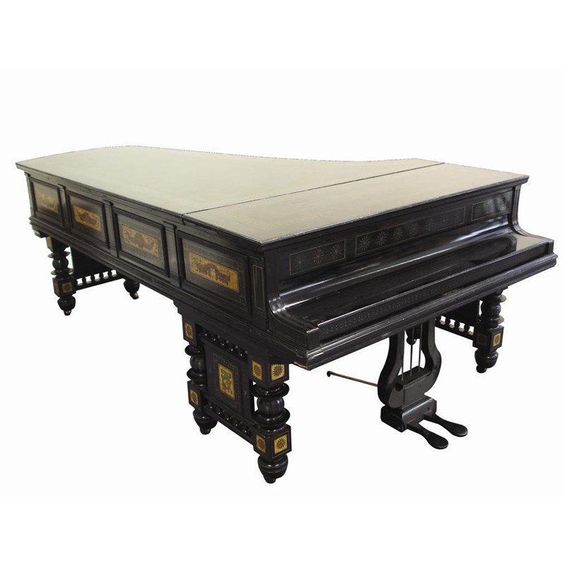 A painted, gilded and ebonised grand piano manufactured by John Broadwood & Sons, 1872 decorated by Cottier & Sons with classical panels , stencilled mark, numbered 20503 254cm. long, 141cm wide