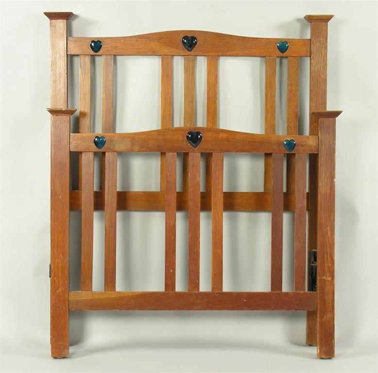 An oak single bed the head and foot boards set with three heart-shaped Ruskin ceramic stones unmarked 93cm wide by 111cm high