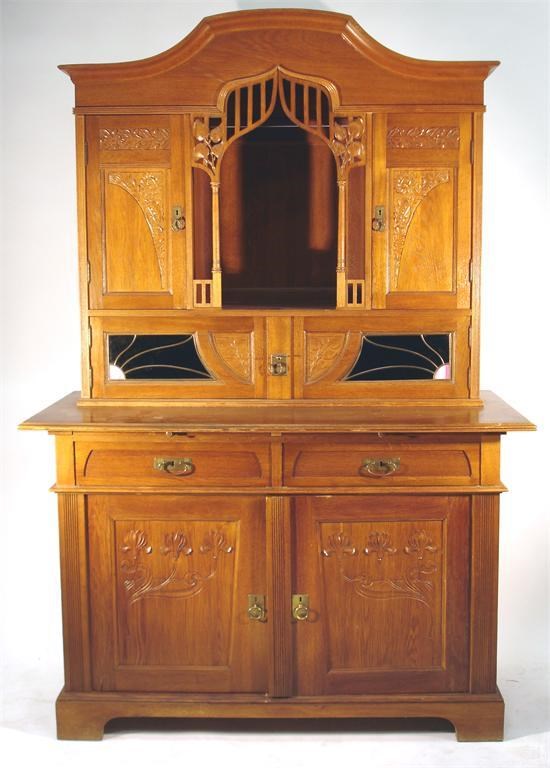 A large Belgian Art Nouveau oak sideboard, with leaded glass panels and carved flower panels, 205cm. high x 147cm. wide.