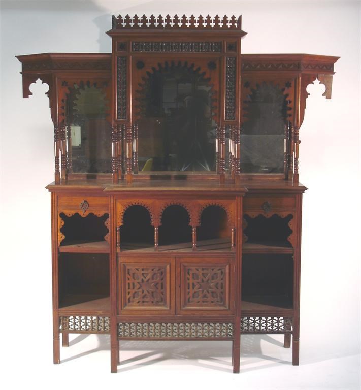 A Liberty & Co. Moorish mahogany sideboard, mirrored back with carved crenellated decoration and applied musharabeyeh panels, 194cm. high