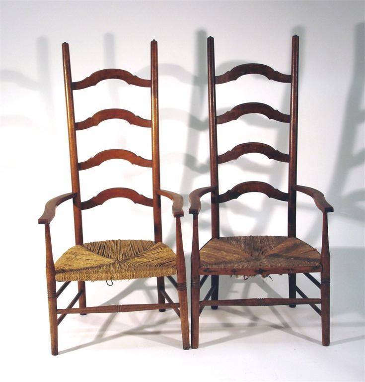 Four Heal & Son turned-oak ladderback armchairs, with rush and string seating, one loose metal retail label 116cm, high.