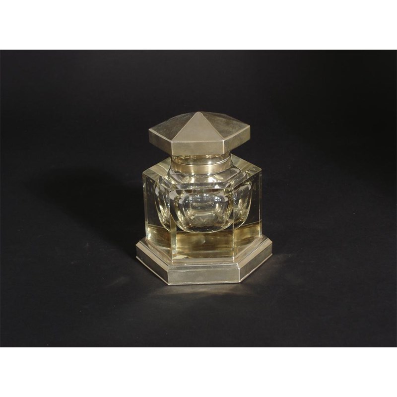 A Continental Art Deco silver and glass inkwell attributed to Gustave Keller, hexagonal section stamped 900 15cm. high