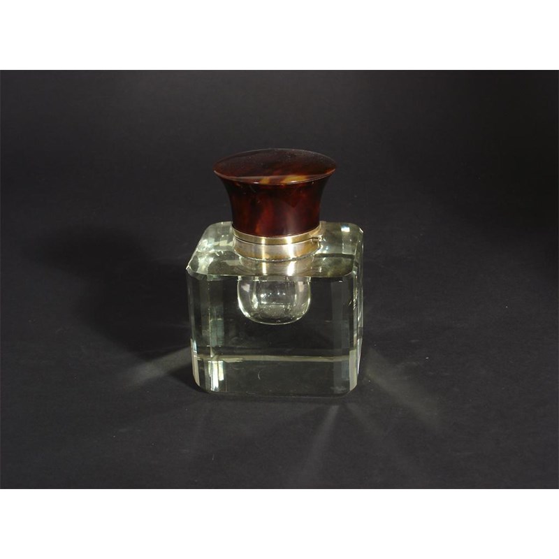 A Tonnel, Paris Art Deco glass and tortoiseshell inkwell chamfered square section with circular tortoiseshell cover stamped marks to the mount 14cm. high