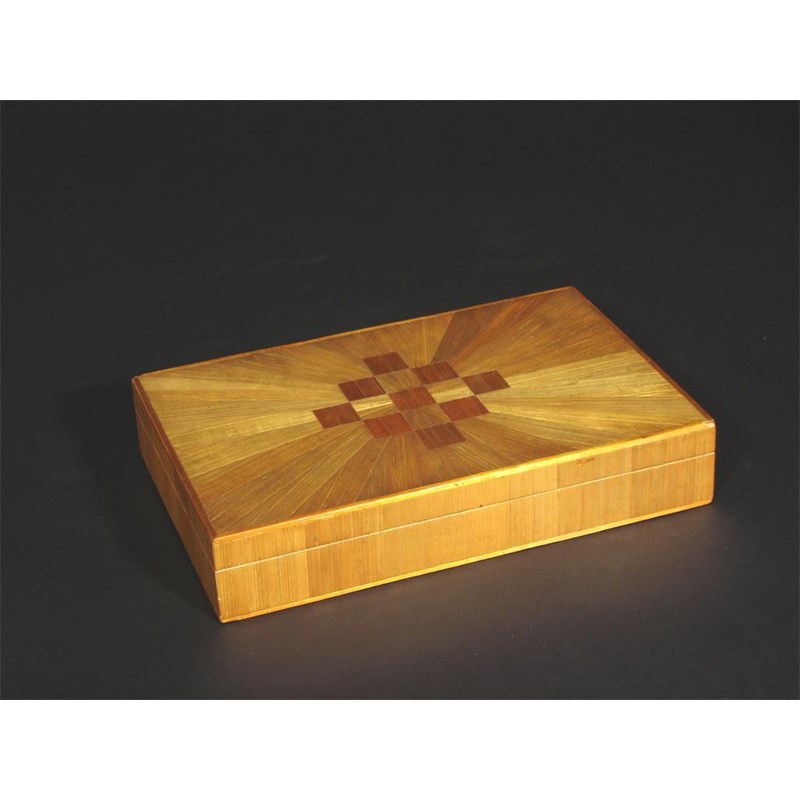 A Louis Vuitton cigarette or card box with three compartment containing two decks of cards and five dice Louis Vuitton paper label 20cm wide