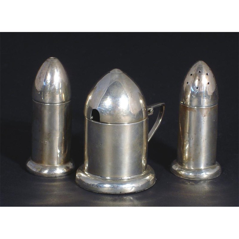 A T Wilkinson silver novelty cruet set each modelled as an artillery shell, stamped marks, Birmingham 1919 7cm. high