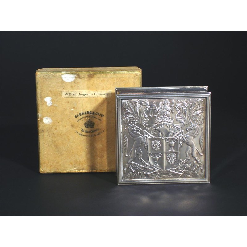 A Garrard & Co commemorative silver cigarette box commemorating the 600th Anniversary of the Goldsmiths Company's first charter 1327-1927, given by the Goldsmiths Company to William Augustus Steward, cast in low relief with coat of arms, in original presentation box inscribed inside cover, stamped marks SG London 1926 9cm. wide