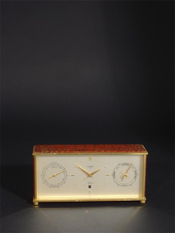 An Asprey Luxor desk time piece model no.1114, with thermometer and barometer dials, brass with crocodile skin panels 18cm. wide.