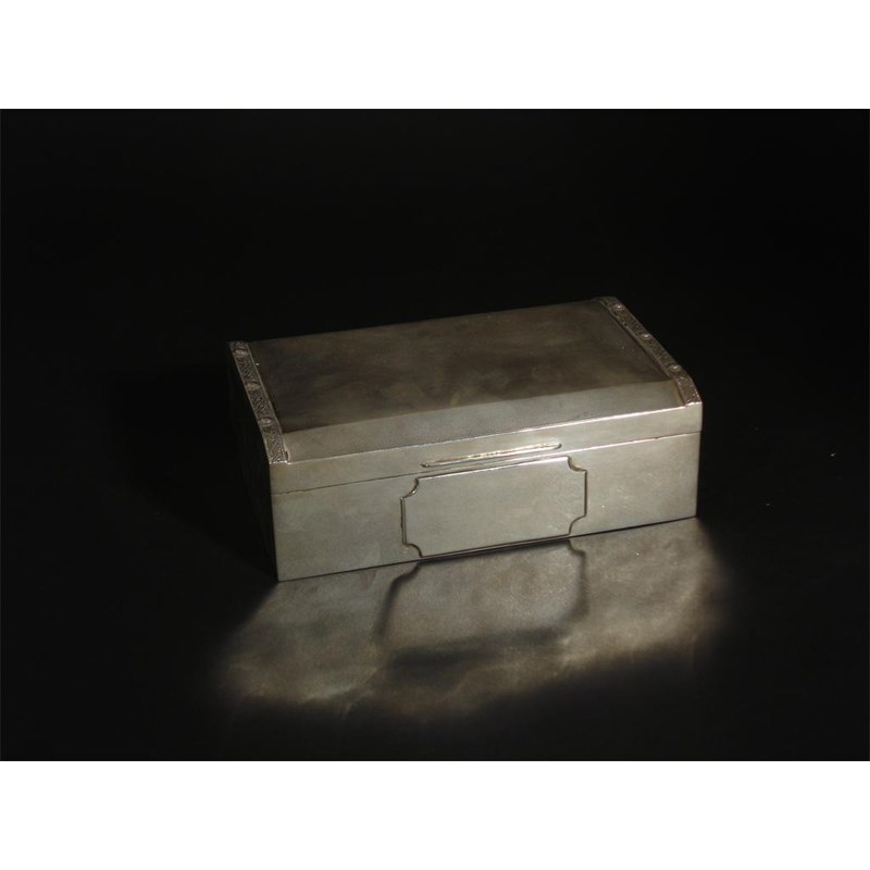 A silver cigarette box rectangular canted form with Celtic borders, cedar lined stamped marks R&D Birmingham 1939 20.5cm. wide