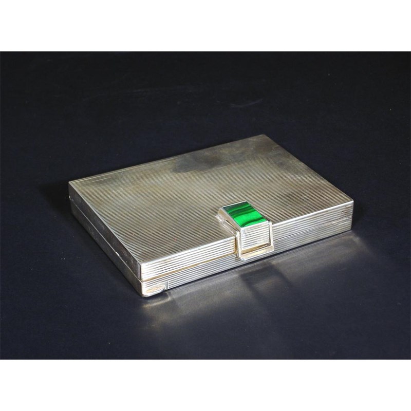 An Italian Art Deco silver and malachite minaudiere rectangular form with reeded decoration, hinged cover, fitted interior and mirror stamped marks to interior 14cm. wide