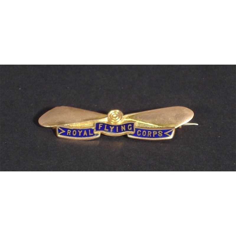 'Royal Flying Corps' an enamelled gold lapel badge modelled as a propeller blade stamped 9ct 4.5cm. wide.