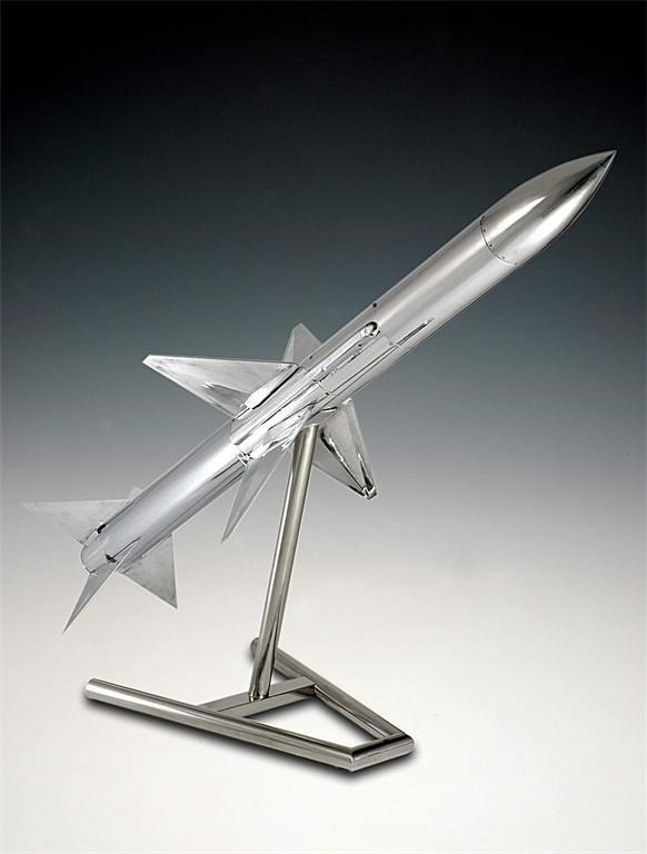 Skyflash a medium range air to air missile, stripped and chromed, circa 1976 designed by British Aerospace Defence, decommissioned and on custom built stand 366cm. long, 102cm wingspan The Skyflash was deployed by the Royal Air Force from 1981. it was carried by the F-4 Phantom, Tornado and F16 fighters and had a range of 45km being guided by Marconi 's mono-pulse system. It was capable of Mach 4, almost 3000 miles per hour, with a manufacturing cost of each missile 250,000.