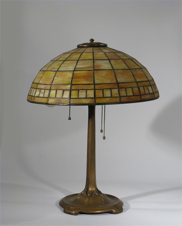 A Tiffany Studios bronze table lamp with matched geometric glass shade, model no.533, stamped marks to base 56 cm. high