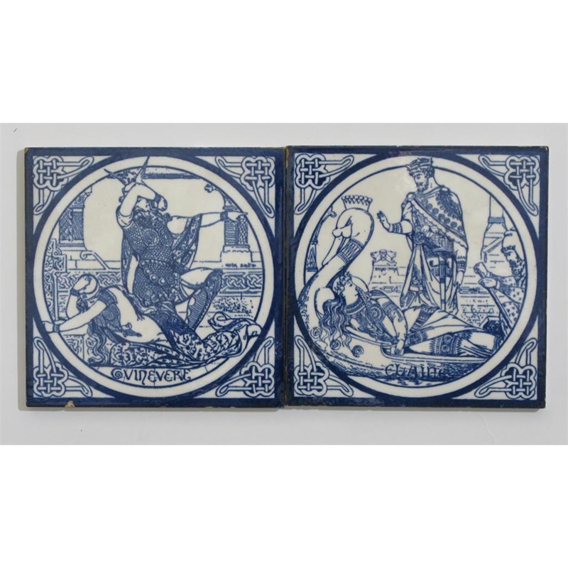 A pair of Minton tiles designed by John Moyr Smith printed in blue on a white ground, entitled 'Elaine' and 'Guinevere' impressed marks, printed signature, minor rim chips 15 cm. square