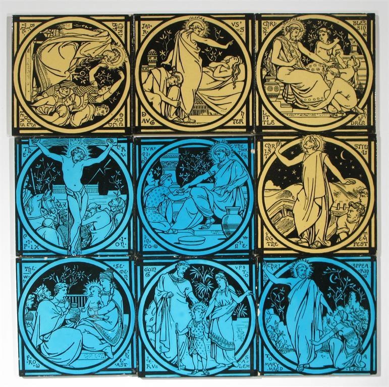 'New Testament' nine Minton tiles designed by John Moyr Smith, printed in black on vivid blue and ochre grounds impressed marks, facsimile signature 15 cm. wide.