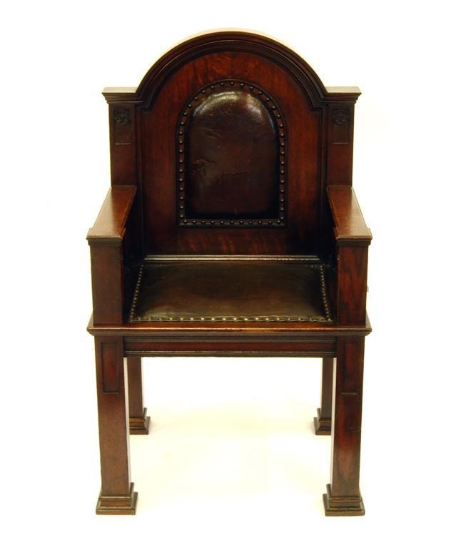 An oak throne chair possibly retailed by Liberty & Co, in the manner of M.H. Baillie Scott, architectural form with carved roundel motif, with leather seat and back pads unmarked 98 cm. high