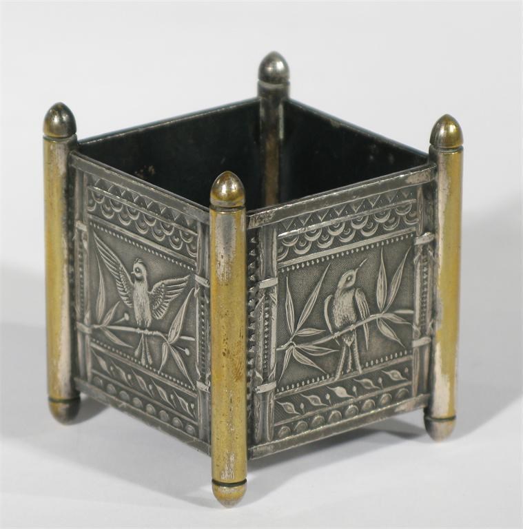 An Aesthetic Movement electroplate napkin ring cast in low relief with a bird perched on branches unsigned 5.5 cm. high