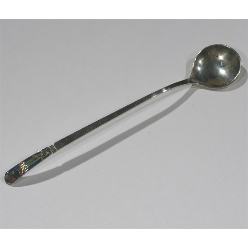 A Bernard Instone enamelled silver spoon the finial enamelled with iris motif stamped marks, Birmingham 1930 18.5 cm. long
