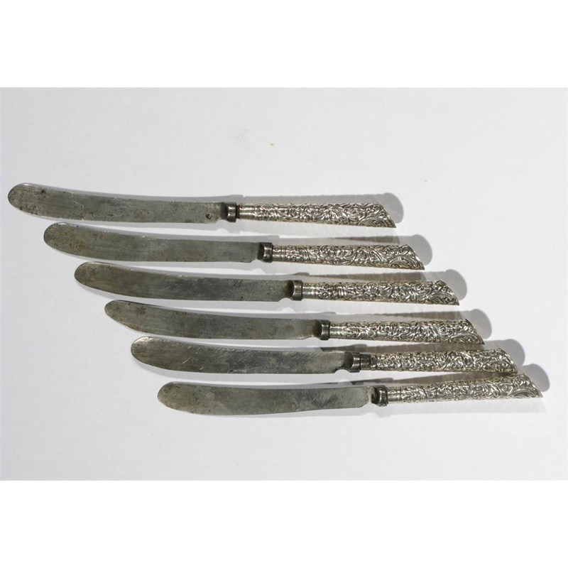 A set of six Aesthetic Movement Hamilton and Inches silver tea knives with steel blades, the handles cast with scrolling foliate design stamped marks, Edinburgh 1891, one replaced 1900 15 cm. long
