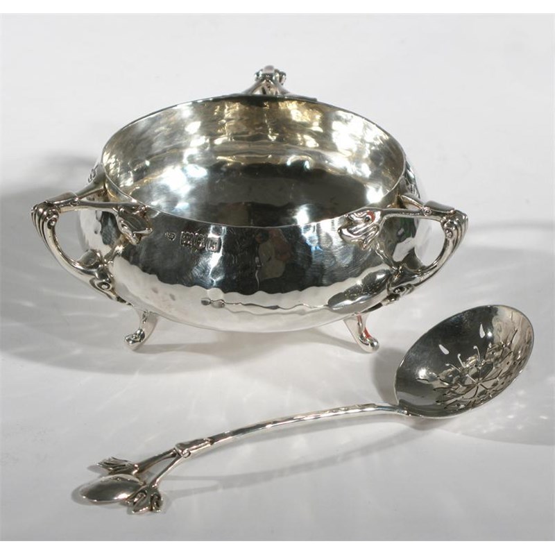 A Mappin & Webb silver christening set, in original silk lined box, comprising a three-handled silver bowl and a spoon, with foliate finial and pierced bowl stamped marks, London 1905, bowl 13 cm. wide