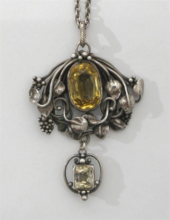 An interesting white metal and Ceylon saphire pendant necklace attributed to the Bromsgrove Guild, cast with fruiting foliage design unmarked 5.5 cm. high