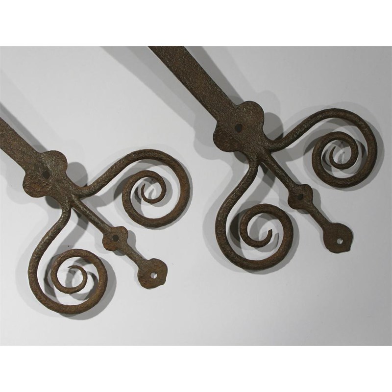 A pair of Gothic Revival large door hinges each with scrolling panel terminals