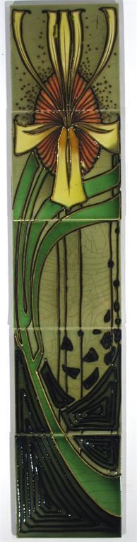 A Minton Secessionist five tile panel designed by John Wadsworth, tubeline decorated with stylised iris flower stems, in yellow, green and salmon pink, highlighted in gilt impressed marks panel 76 cm. high