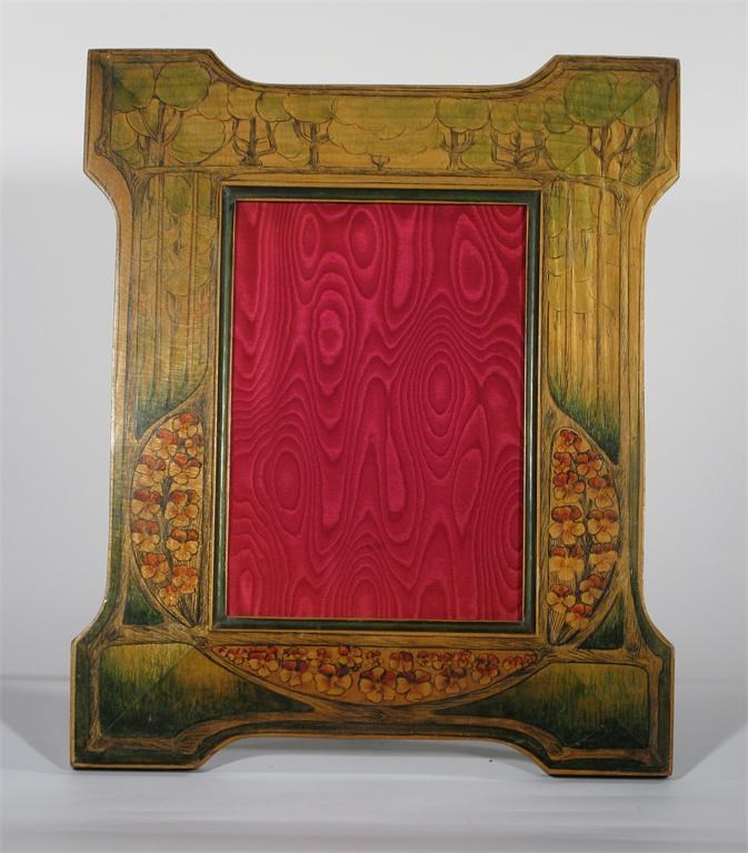 A painted wood picture frame easel backed, the shaped rectangular front painted with flowers in a woodland setting unsigned 36.5 cm. high