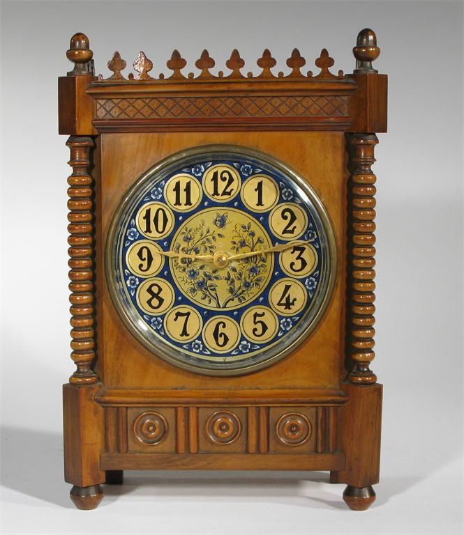 An Aesthetic Movement mahogany case mantel clock in the manner of Lewis F Day, the face enamelled in blue with prunus spray, Arabic numerals, unsigned 29 cm. high