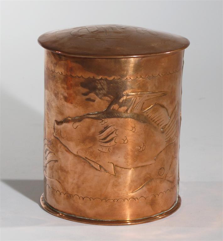 A Newlyn copper tea caddy and cover cylindrical form hammered in low relief with fish a sea snail and an anemone, the cover titled 'Tea', stamped Newlyn 14 cm. high