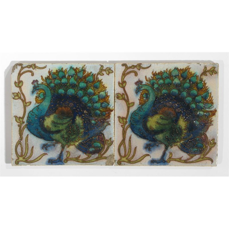A pair of Carter's Poole Pottery tiles each tubeline decorated with a peacock, in colours on a white ground