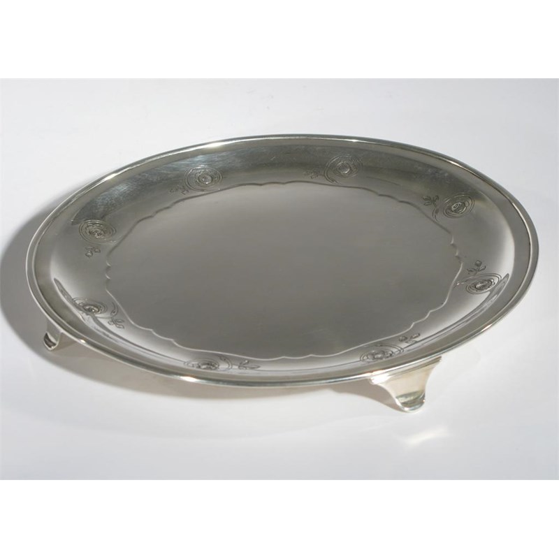 An American silver tray by Arthur Stone, circular section, the rim stamped in low relief with a frieze of roses, stamped marks Sterling 24 cm. diam.