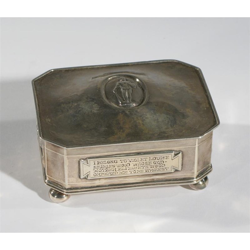 A silver box and cover by Nelson Dawson shaped rectangular section, the lightly domed cover decorated with a figure holding club and shield, the sides and back with swags stamped marks, London 1906 11.5 cm. wide.
