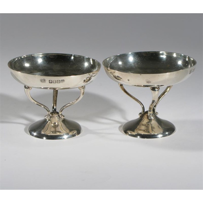 A pair of Art Nouveau D & G Edwards silver pedestal dishes each on tripod stem, domed bowl and cover, stamped marks, Glasgow 19187 cm. high