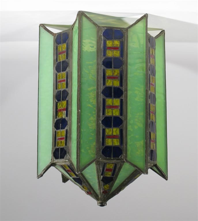 A leaded glass lantern, possibly Dutch, faceted section, with alternate panels of green, blue and yellow geometric panels unmarked 31cm. high