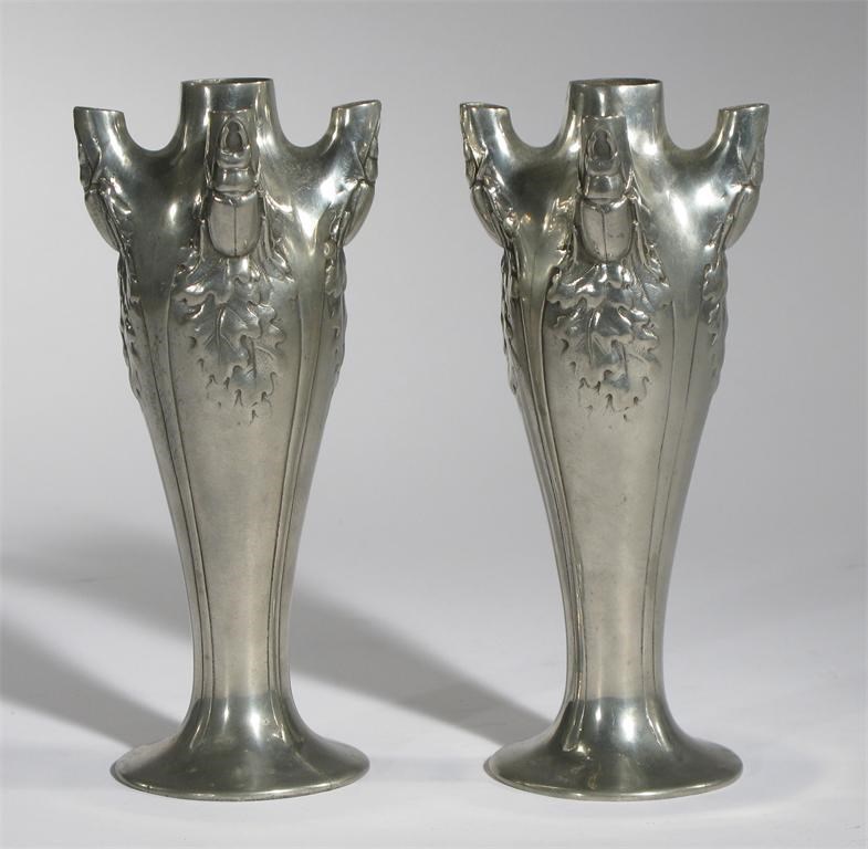 A pair of Art Nouveau Gallia spill vases model no.4842, four stems each cast with a stag beetle, stamped marks 17.5 cm. high