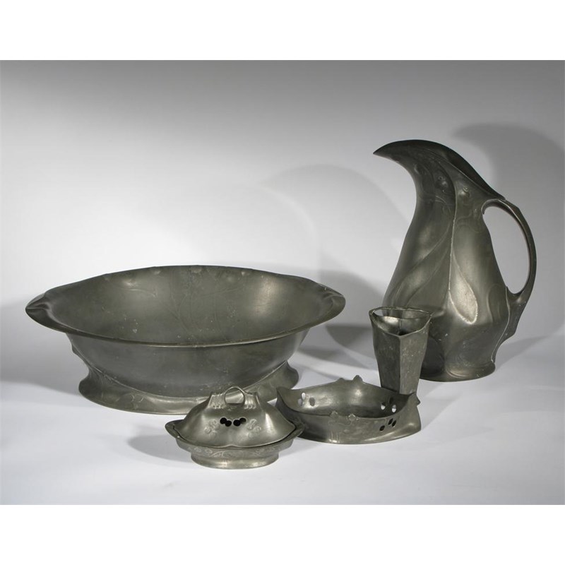 An Art Nouveau Kayserzinn pewter five piece wash set the design attributed to Hugo Leven, cast in low relief with opium poppyheads, comprising; wash basin and ewer, soap dish and cover, dish and toothbrush holder stamped marks, ewer 36cm. high