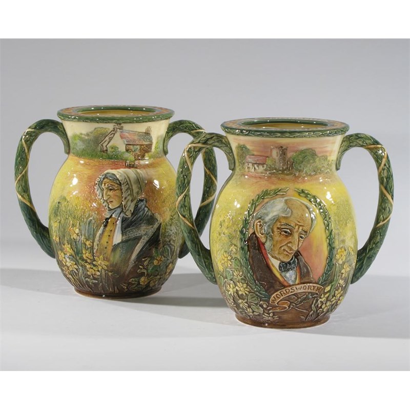 'William Wordsworth' a pair of Royal Doulton twin-handled vases designed by Charles Noke, modelled in low relief, painted in colours printed marks 17 cm. high