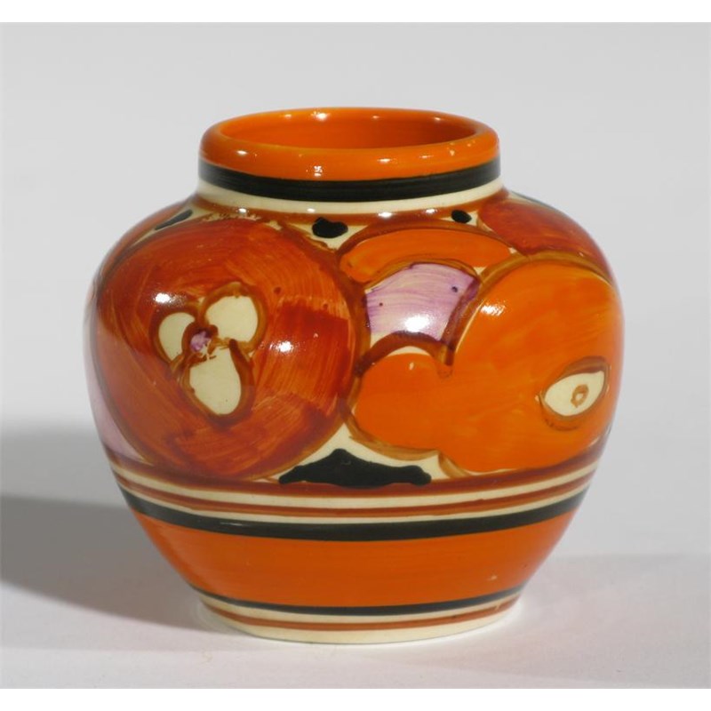 'Sliced Fruit' a Clarice Cliff miniature vase designed by Clarice Cliff, painted in colours between orange and black bands printed factory mark 6 cm. high
