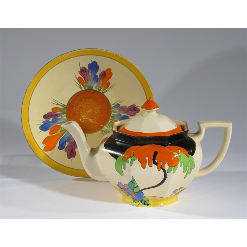 'Woodland' a Clarice Cliff Athens teapot and cover designed by Clarice Cliff, printed and painted in colours on a cream ground, and a 'Crocus' Clarice Cliff sandwich plate printed marks, wear to  crocus plate 17 cm. high