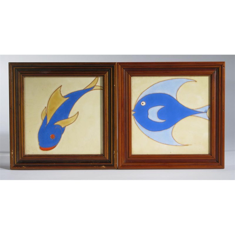 Two Carter's tiles tubeline decorated with stylised fish, in shades of blue, yellow and orange on a cream ground, framed impressed marks, 15 cm. square.