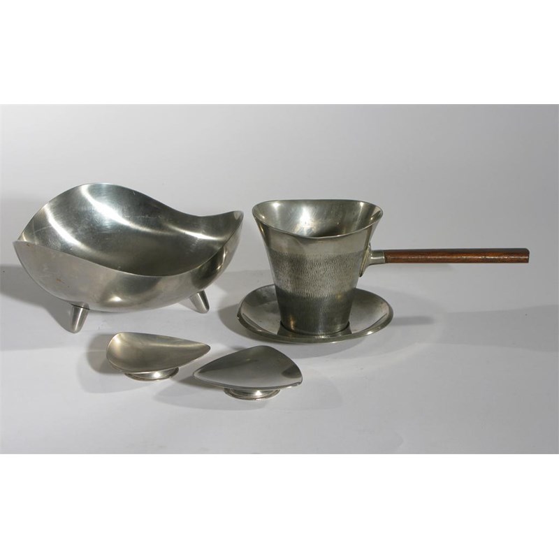 A Viners pewter and rosewood pourer and saucer designed by Gerald Benney with simple geometric decoration, and a collection of Danish stainless steel domestic ware stamped marks, facsimile signature 19. 5 cm. wide