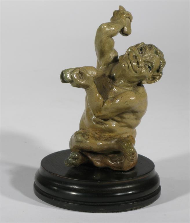 A Martin Brothers stoneware Imp Musician figure by Robert Wallace Martin, modelled playing castanets, covered in a ochre to green glaze, on ebonised wood base incised R W Martin Southall to bottom, minor professional restoration to toe 14.5 cm. high